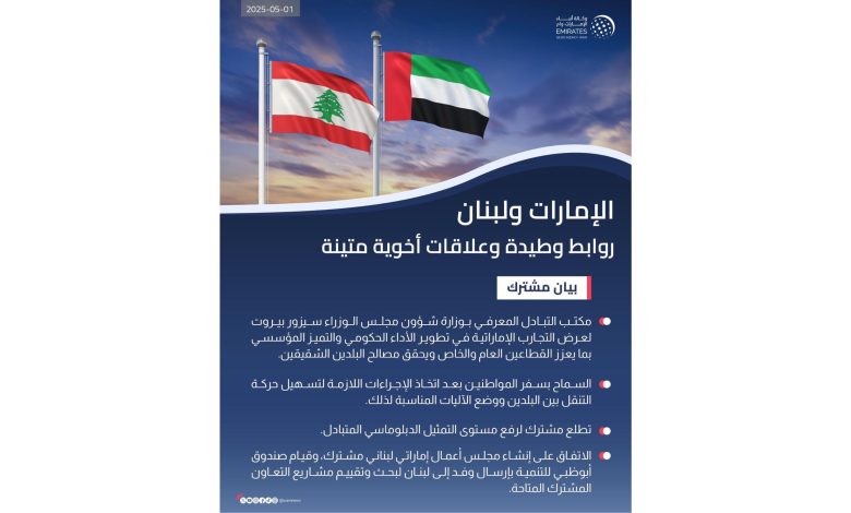 وبحث الجانبان العلاقات الثنائية وسبل تنميتها في مختلف المجالات، وتطوير الجوانب الاقتصادية والاستثمارية من خلال الاستفادة من الفرص المتاحة، وتنمية تبادل الخبرات، وتطوير مجالات العمل الحكومي، حيث سيقوم مكتب التبادل المعرفي في وزارة شؤون مجلس الوزراء بزيارة إلى بيروت لإطلاع الجانب اللبناني على التجارب الناجحة لدولة الإمارات في مجال تطوير الأداء الحكومي، وتنمية ممارسات الأداء والتميز المؤسسي بما يعزز القطاعين العام والخاص، ويحقق مصالح البلدين.