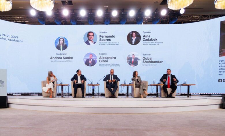 وشارك في الجلسة التي أدارتها المذيعة أندريا سانكي، مقدمة برنامج “The Newsmakers” على قناة ” TRT World” التركية، الأستاذ فرناندو سواريس، الرئيس التنفيذي لقناة Euronews في باكو، ألكسندرو جيبوي، الأمين العام لتحالف وكالات الأنباء الأوروبية، الأستاذة أينا زادابيك، (رئيس مجلس إدارة شركة)، والسيد أوبي شهباندر، مراسل القناة التلفزيونية الدولية AnewZ .
