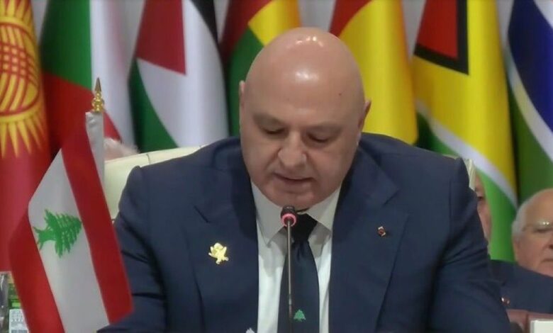 وقال الرئيس اللبناني إن الجمعيةِ العامة للأممِ المتحدة (حيث يلتئمُ كل العالم الساعي إلى السلام) ستنعقد بعد أيام قليلة في نيويورك، و”لنذهبْ إلى هناك بموقفٍ موحّد، يجسّدُه سؤالٌ واحد: هل تريد حكومة إسرائيل، أي سلام دائم عادل في منطقتنا؟”.. مضيفا أنه إذا كانت إسرائيل تريد السلام فإن العرب جاهزون وفقاً لمبادرة السلام العربية التي طرحتها المملكة العربية السعودية في قمة بيروت عام 2002 وتبنتها جامعة الدول العربية بالإجماع، وتلقى تأييدا دوليا واسعا بدأ يترجم من خلال اعتراف دول عديدة بدولة فلسطين.. مشيرا إلى الإعلان الذي صدر منذ أيام عن الجمعية العامة للأمم المتحدة بأغلبية ساحقة تحت مسمى /إعلان نيويورك/ للاعتراف بدولة فلسطين، والذي جاء نتيجة جهد دؤوب من المملكة العربية السعودية، وفرنسا، والذي يحدد “خطوات ملموسة ومحددة زمنياً ولا رجعة فيها” نحو حل الدولتين.