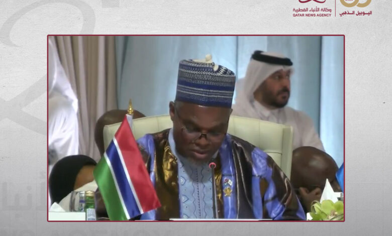 وأعرب نائب رئيس جمهورية غامبيا، خلال كلمته ضمن أعمال القمة العربية الإسلامية الطارئة بالدوحة، عن تضامن بلاده مع دولة قطر في هذه الأوقات الحرجة، وتقديرها العميق لجهود الوساطة التي تبذلها لحل الصراعات حول العالم ولاسيما في الحرب على قطاع غزة.