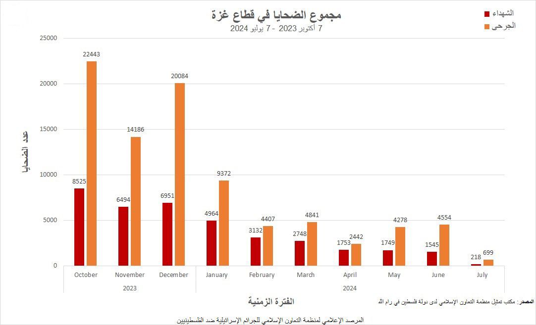 التقرير الأسبوعي لمرصد منظمة التعاون الإسلامي الإعلامي لجرائم إسرائيل ضد الفلسطينيين ٢– ٨ يوليو ٢٠٢٤ إسرائيل تدمر غزة والقطاع الصحي تتهاوى مستشفياته الواحد تلو الآخر قوات الاحتلال تهدم (١٦) منزلا والمستوطنون يغيرون (٦٤) مرة على قرى الضفة الغربية في أسبوع