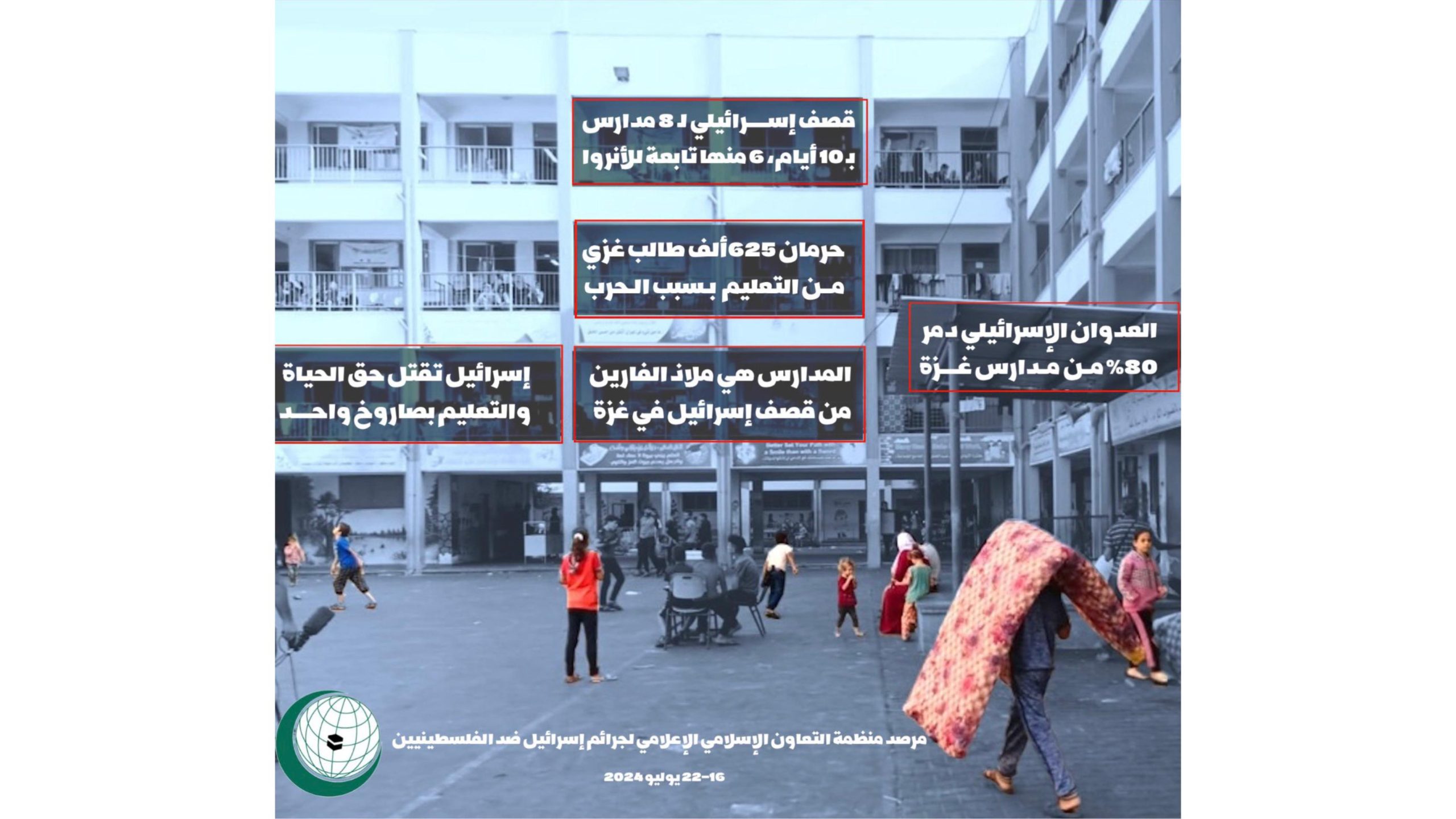 التقرير الأسبوعي لمرصد منظمة التعاون الإسلامي الإعلامي لجرائم إسرائيل ضد الفلسطينيين 16 – 22 يوليو 2024 إسرائيل تتحدى الأمم المتحدة وتقصف مدارسها في مجازر يومية ضد النازحين مصادرة وتدمير وحرق (372) مركبة و(199) محلا تجاريا في الضفة الغربية
