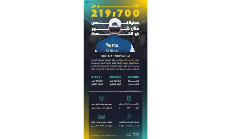 مكة المكرمة (يونا/واس) – تواصل الفرق الرقابية في الهيئة العامة للنقل جهودها استعدادًا لموسم الحج 1446هـ، حيث نفذت بالتعاون مع الجهات المعنية أكثر (219.772) ألف عملية فحص على أنشطة النقل في مكة المكرمة والمدينة المنورة خلال الفترة من (1) ذو القعدة حتى (1) ذو الحجة، نتج عنها أكثر من (20.429) ألف مخالفة محررة و(5.996) مخالفة بواسطة الرصد الآلي.