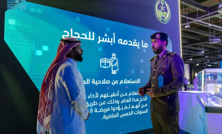 وتعرّف “أبشر” لزوار جناح وزارة الداخلية، الخدمات المقدمة لضيوف الرحمن منذ وصولهم إلى المملكة كطباعة تصريح الحج والاستعلام عن أحقية أداء مناسك الحج، واستعراض الهوية الرقمية للزوار.