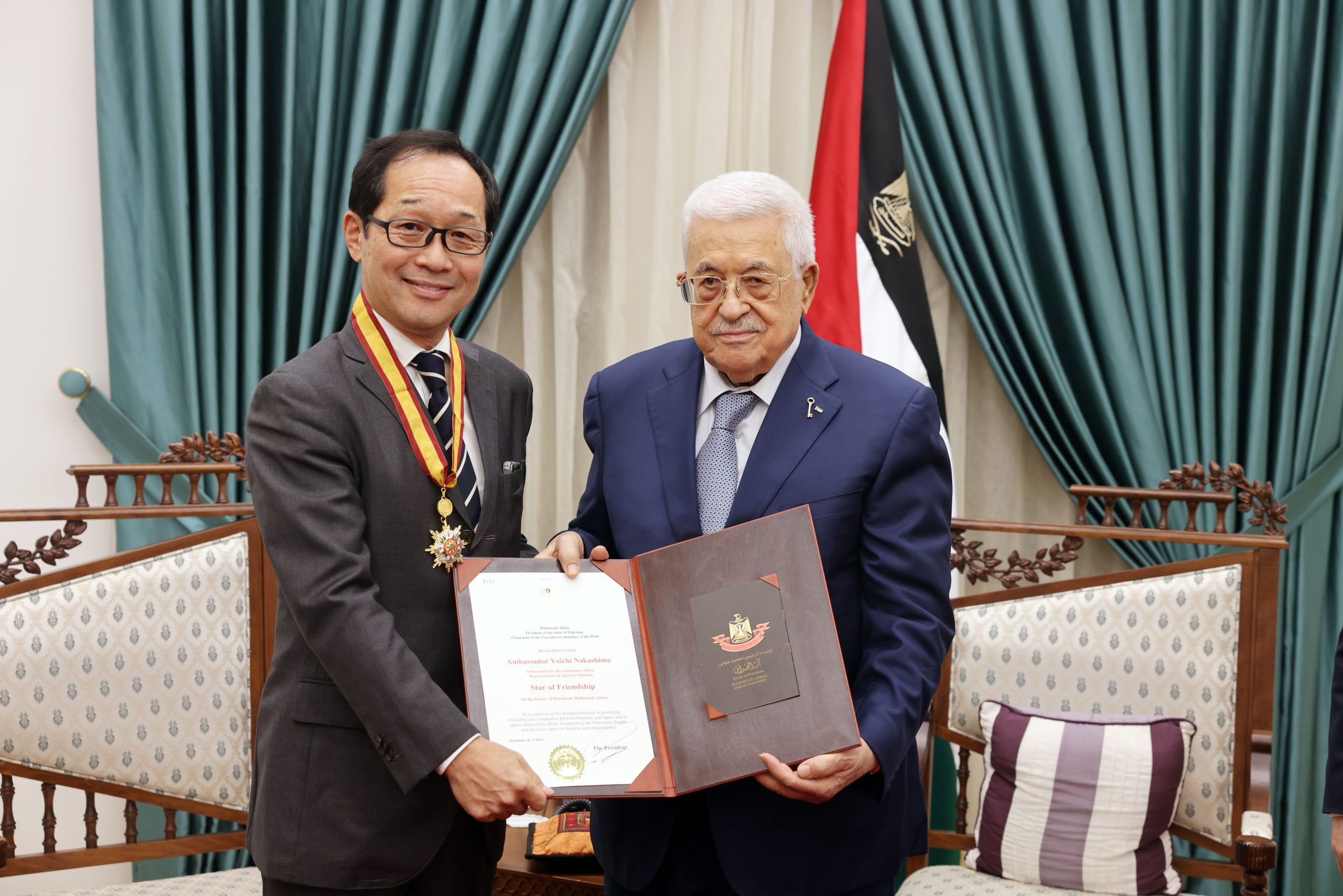 الرئيس الفلسطيني يقلد السفير الياباني السابق نجمة الصداقة من وسام الرئيس محمود عباس