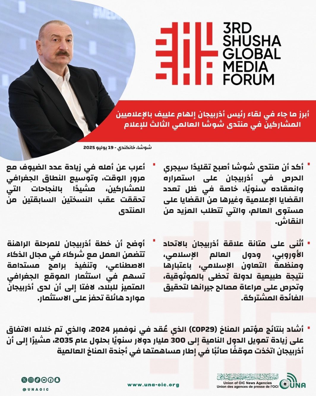 رئيس جمهورية أذربيجان: نجاحات منتدى شوشا وقضايا الإعلام العالمية تفرض استمرار انعقاده سنويًا