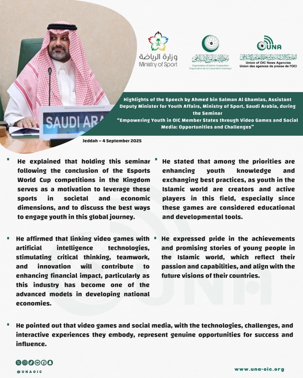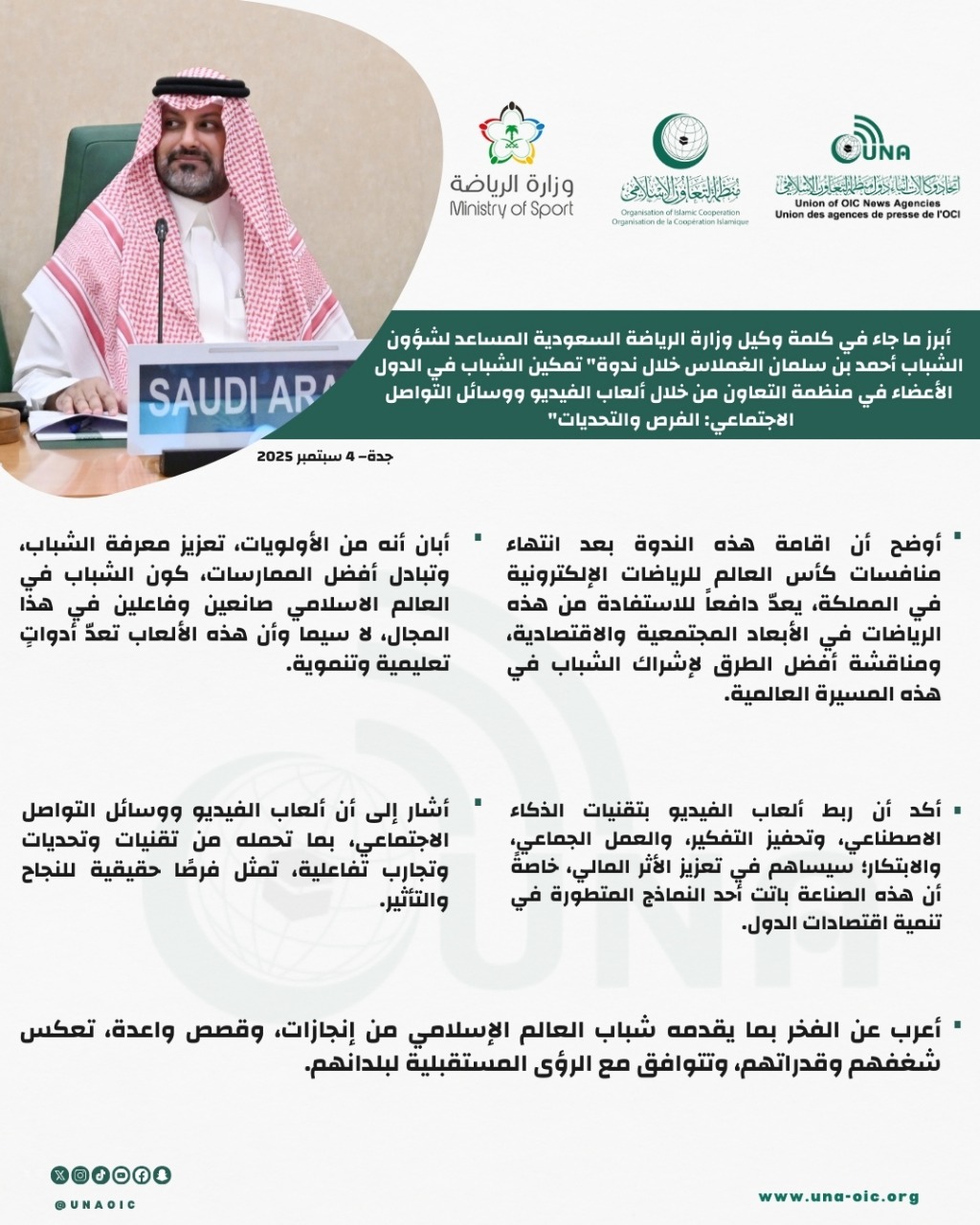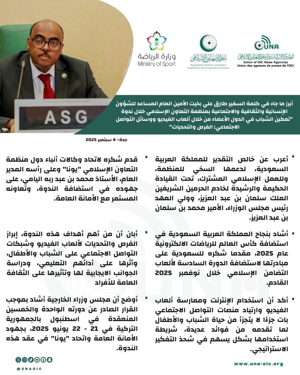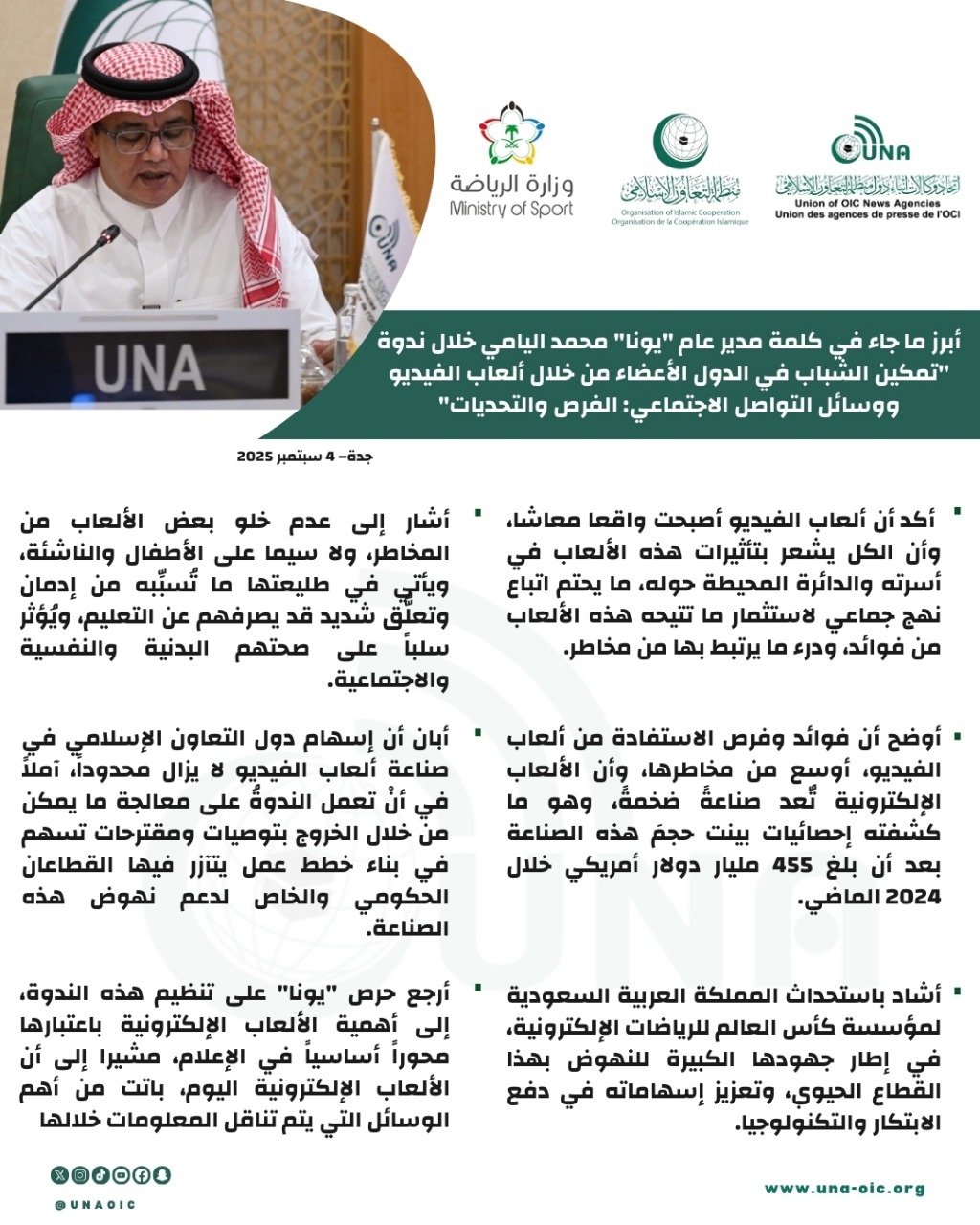 إنفوجرافيك الندوة الدولية “تمكين الشباب في الدول الأعضاء بمنظمة التعاون الإسلامي من خلال ألعاب الفيديو ووسائل التواصل الاجتماعي: الفرص والتحديات” التي تعقد بتنظيم مشترك بين الاتحاد، ومنظمة التعاون الإسلامي، ووزارة الرياضة السعودية