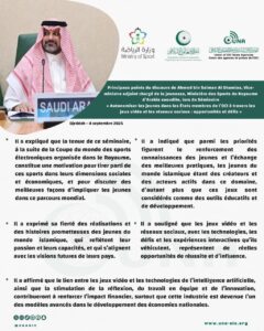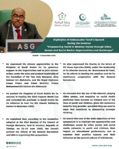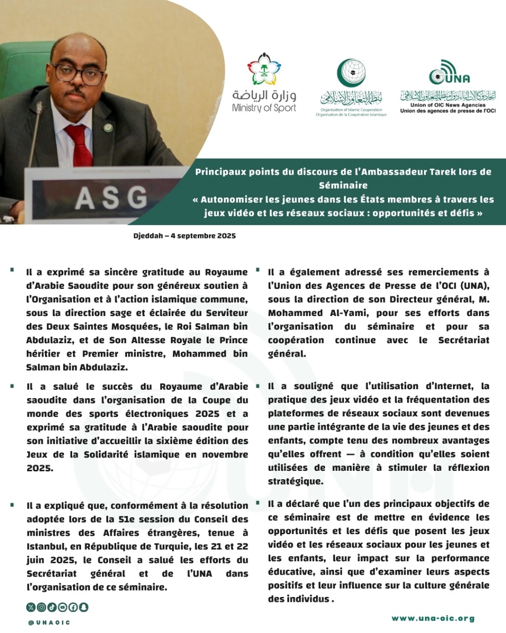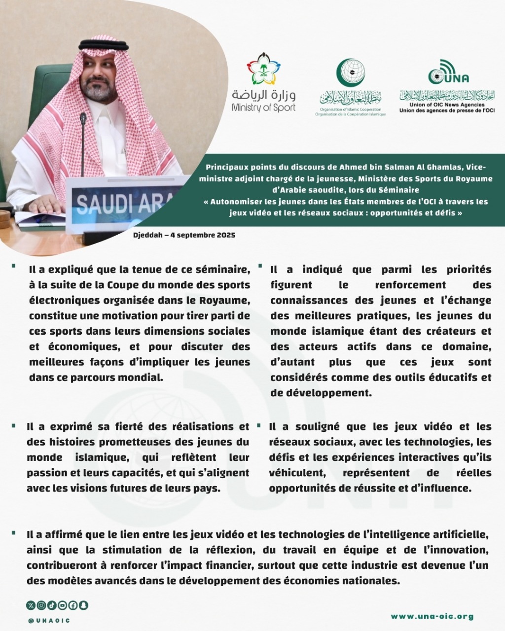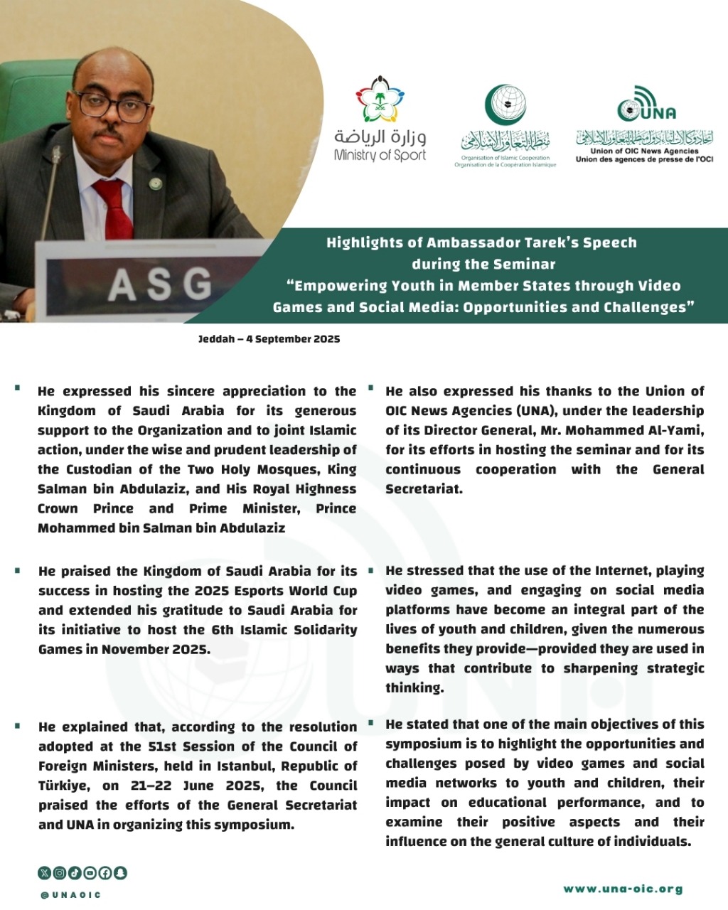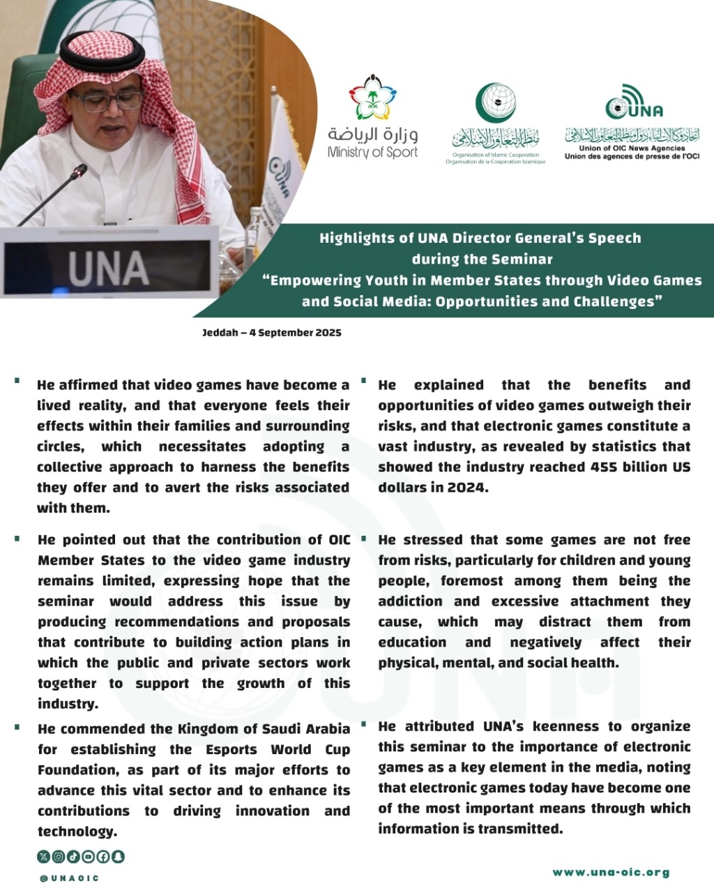 إنفوجرافيك الندوة الدولية “تمكين الشباب في الدول الأعضاء بمنظمة التعاون الإسلامي من خلال ألعاب الفيديو ووسائل التواصل الاجتماعي: الفرص والتحديات” التي تعقد بتنظيم مشترك بين الاتحاد، ومنظمة التعاون الإسلامي، ووزارة الرياضة السعودية