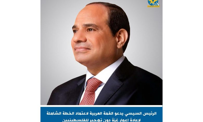 كما دعا رئيس الجمهورية إلى اعتماد هذه الخطة في القمة غير العادية لجامعة الدول العربية المنعقدة اليوم الثلاثاء بالعاصمة الإدارية – حشد الدعم الإقليمي والدولي للخطة؛ فهي خطة، تحفظ للشعب الفلسطيني، حقه في إعادة بناء وطنه، وتضمن بقاءه على أرضه.