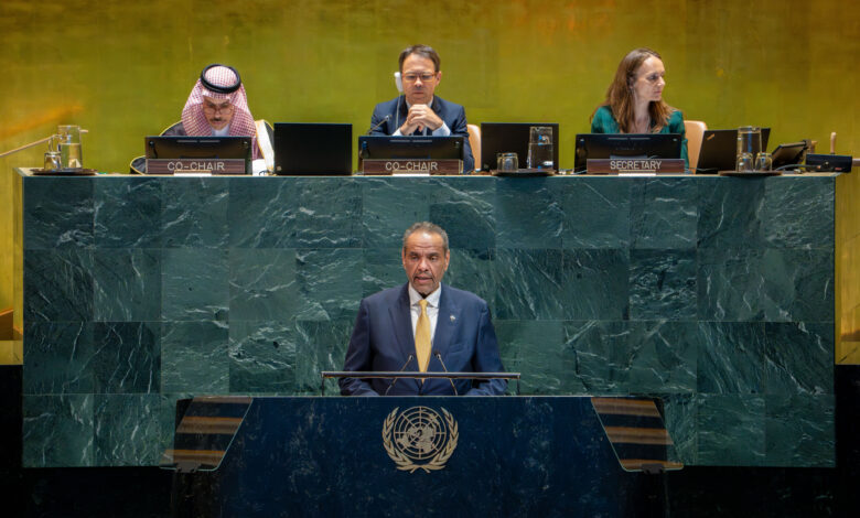 جاء ذلك في كلمة الوزير اليحيا التي ألقاها أمام المؤتمر الدولي رفيع المستوى لتسوية قضية فلسطين بالوسائل السلمية وتنفيذ حل الدولتين في مقر الأمم المتحدة بنيويورك.