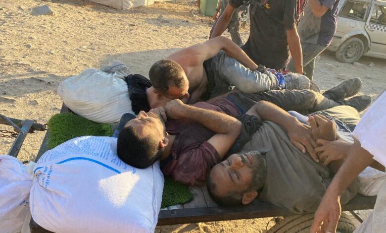 ثلاثة شبان مصابون على كارة يجرها حمار بالكاد يستطيع السير، أحدهم أصيب بإطلاق نار في ظهره والثاني في ساقيه اللتين تنزفان دما وقد ربط أصدقاؤه عصابة عليهما في محاولة لوقف النزيف. أما الثالث فقفز عن شاحنة الطحين وداسته الأقدام فأغمي عليه كما قال مرافقوهم.