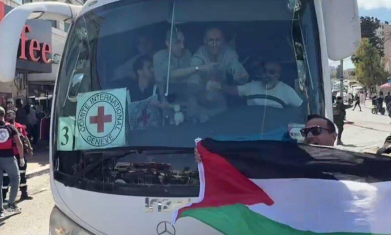 رام الله (يونا/وفا) – وصل 96 معتقلا محررا من ذوي المؤبدات والأحكام العالية، أفرجت عنهم سلطات الاحتلال الإسرائيلي، من سجن “عوفر” غرب مدينة رام الله، إلى قصر رام الله الثقافي في بيتونيا، في إطار المرحلة الأولى من اتفاق وقف إطلاق النار.