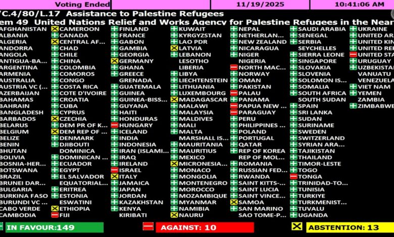 نيويورك (يونا/وفا) – بتأييد 149 دولة ومعارضة 10 وامتناع 13 عن التصويت، اعتمدت اللجنة الرابعة للجمعية العامة للأمم المتحدة قرارا حول مساعدة لاجئي فلسطين وتجديد ولاية وكالة الأونروا.
