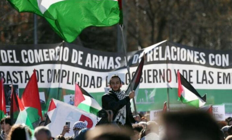 ورفع المشاركون الأعلام الفلسطينية، ولافتات كتبت عليها عبارات من قبيل “الكرامة الإنسانية مصونة”، و”الحرية للأسرى الفلسطينيين”، مطالبين بمحاكمة مرتكبي جرائم الحرب، ورددوا شعارات، من بينها “أوقفوا الإبادة الجماعية”، و”إسرائيل إرهابية”، و”الأطفال يريدون العيش”.