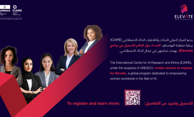 الرياض (يونا) – يواصل المركز الدولي لأبحاث وأخلاقيات الذكاء الاصطناعي (ICAIRE) برعاية منظمة اليونسكو بالرياض، استقبال طلبات التسجيل في برنامج (إليفيت) الذي يستهدف تمكين 25 ألف امرأة من مختلف الجنسيات في مجال الذكاء الاصطناعي، لدعمها في الدخول لسوق العمل العالمي الذي تشهد قطاعاته دخول تقنيات الذكاء الاصطناعي في مختلف مجالاته.