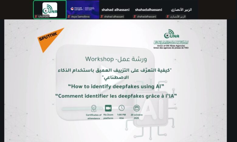 جدة (يونا) – نظم اتحاد وكالات أنباء دول منظمة التعاون الإسلامي “يونا”، اليوم الاثنين 20 أكتوبر 2025، بالتعاون مع وكالة سبوتنيك الروسية، ورشة عمل افتراضية بعنوان “كيفية التعرف على التزييف العميق باستخدام الذكاء الاصطناعي”، بمشاركة فاعلة من ممثلي وكالات الأنباء بالدول الأعضاء في منظمة التعاون الإسلامي وعدد من الإعلاميين، تجاوز عددهم 250 مشاركا.