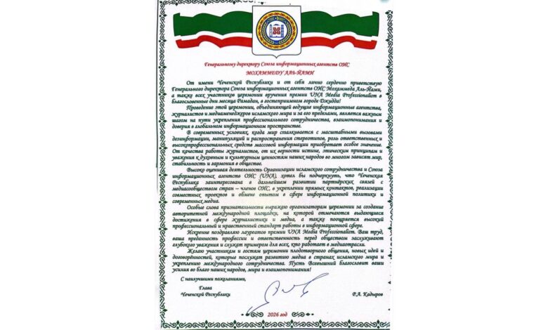 وأبدى فخامته تقديره الكبير لأنشطة اتحاد وكالات أنباء دول منظمة التعاون، والأمانة العامة للتعاون الإسلامي، مؤكدا أن جمهورية الشيشان مهتمة بتطوير الشراكات مع المجتمع الإعلامي في الدول الأعضاء في المنظمة، وتعزيز الاتصالات المباشرة، وتنفيذ المشاريع المشتركة، وتبادل الخبرات في مجال السياسة الإعلامية والإعلام الحديث.